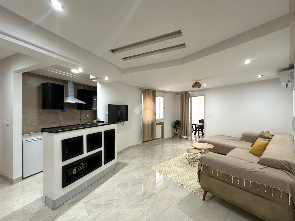 Dès l’entrée, vous découvrirez un salon lumineux, soigneusement aménagé, ouvert sur un coin kitchenette moderne et entièrement équipé.
