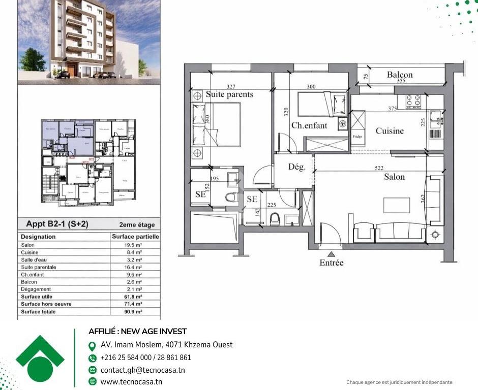 Appartement S+2 situé dans une résidence neuve en phase de finition, équipée d’un ascenseur et proche des commodités, écoles et transports.