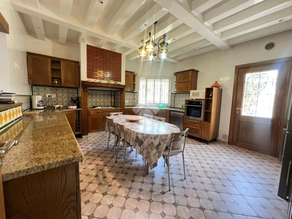 À l’intérieur, la villa offre des espaces de vie spacieux et confortables. Le salon, lumineux et accueillant, est séparé de la salle à manger, permettant de délimiter les différents espaces de vie tout en conservant une circulation fluide. La cuisine, indépendante et entièrement équipée, arbore un style rustique chaleureux et s’ouvre sur le jardin.