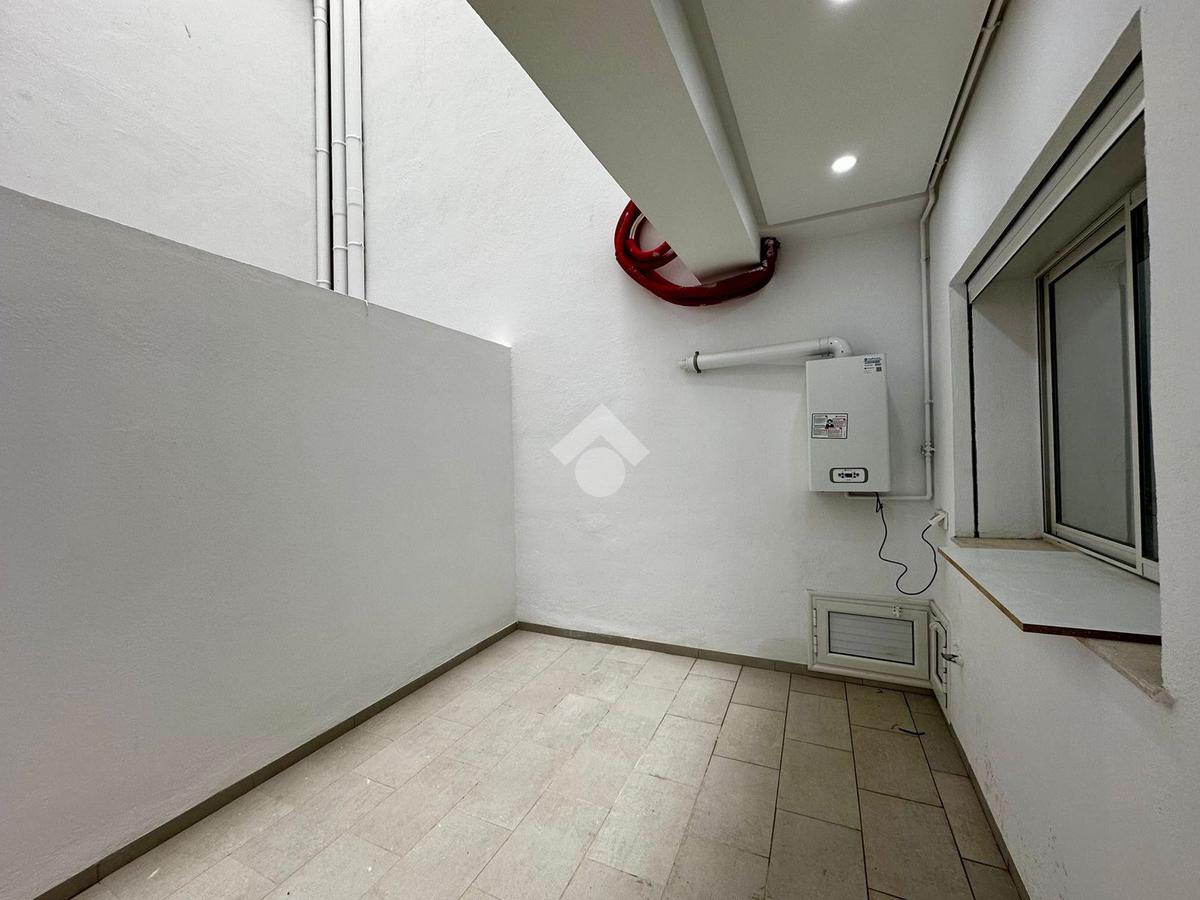 La cuisine indépendante équipée comprend des éléments de rangement, une plaque, une hotte et un four électrique, avec accès à un séchoir.